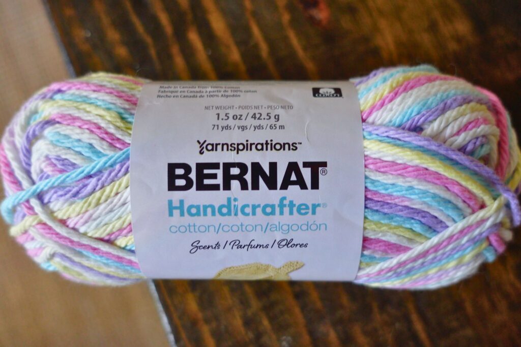 This next yarn is truly unique (and I’m not sure it’s a good thing). Bernat Handicrafter Scents is a #4 worsted weight, 100% cotton yarn. It gently releases a subtle fragrance as you work with it.