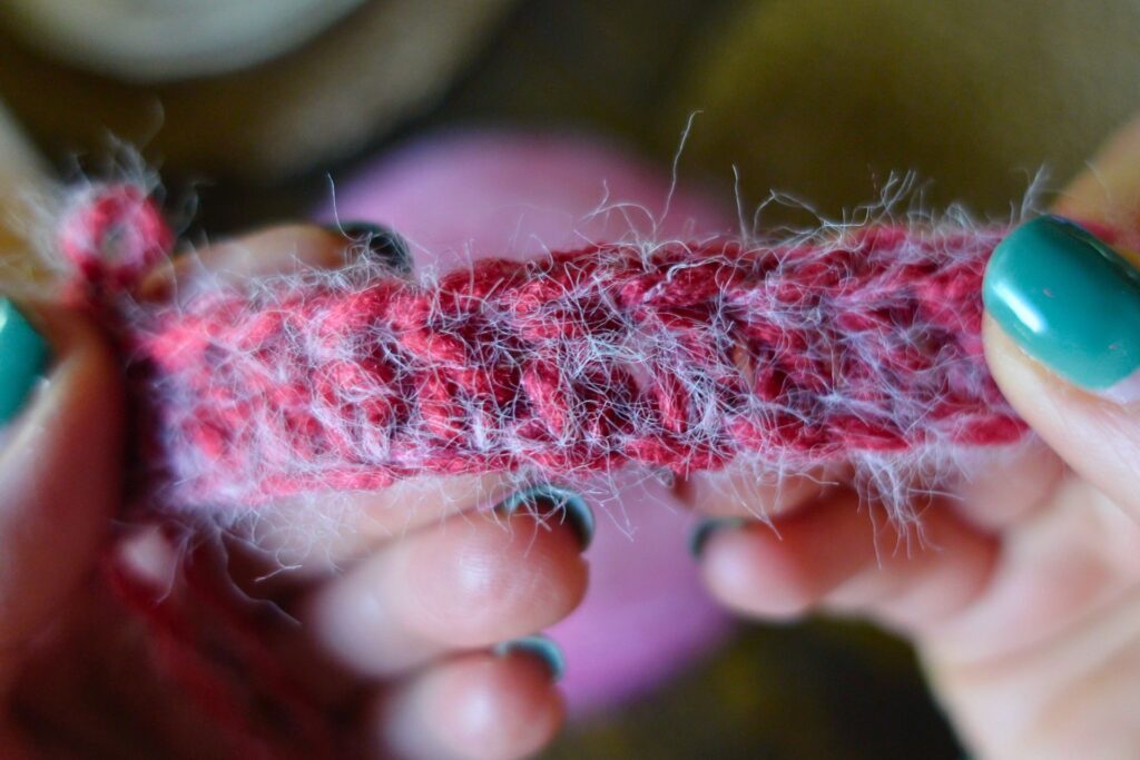 If I was making a project with this yarn, I would use a simple stitch. Because of that halo, you are unlikely to see the details of the stitches. It wouldn’t be worth the effort to make a detailed/complicated stitch because you would never see it.