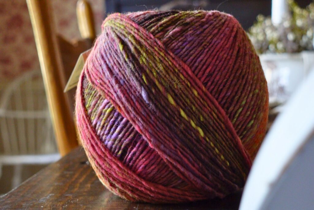 A two ply yarn is created by twisted two individual strands together. And you can really see that with this yarn. The first ply is variegated and the second one is a solid color, which gives it a hand-spun look.