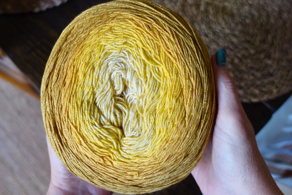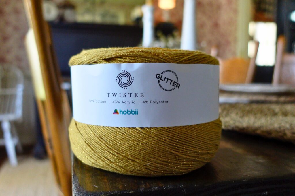I am so excited to try Twister Glitter in the color Yellow Snapdragon. I paid $38 for this yarn cake and it’s 53% cotton and 43% acrylic and 4% polyester