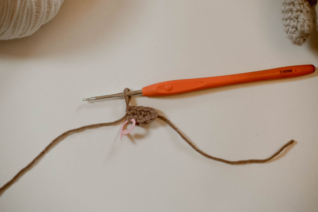 - Sc into the inside edge of Leg 1 to join, add st marker as this will be the new 1st st of the joined round. (PHOTO 5)