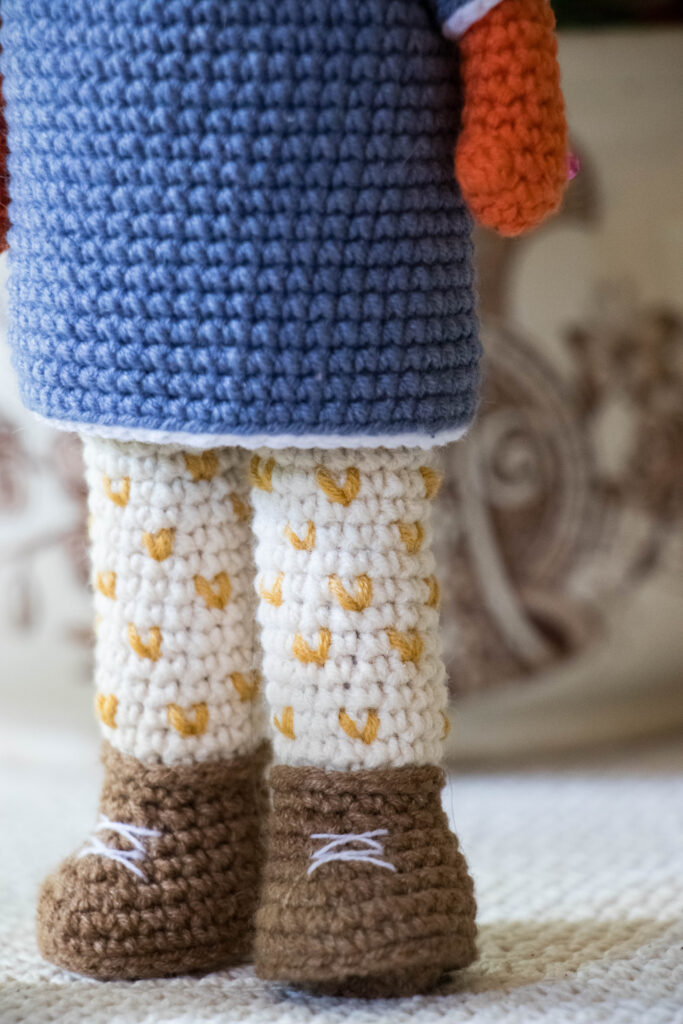 Optional: With yellow color embroider “V” stitch to legs every three sts around legs.